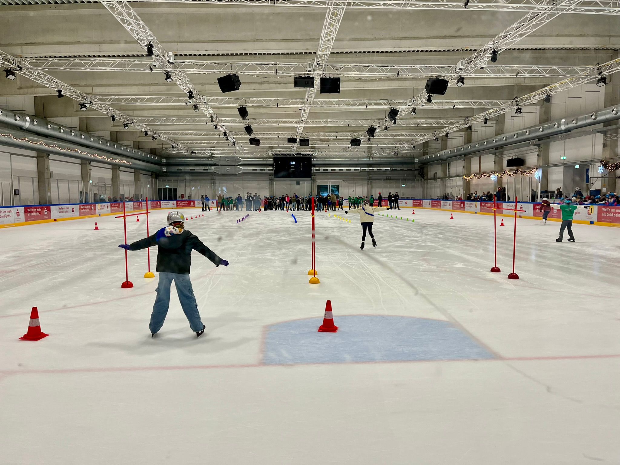 In verschiedenen Übungen zeigten unsere Schülerinnen und Schüler, was sie seit den Sommerferien im wöchentlichen Eislaufunterricht gelernt hatten. Die gezeigten Elemente wurden von Punktrichtern bewertet. Zum Abschluss traten die einzelnen Schulen in einer spannenden Staffel gegeneinander an.