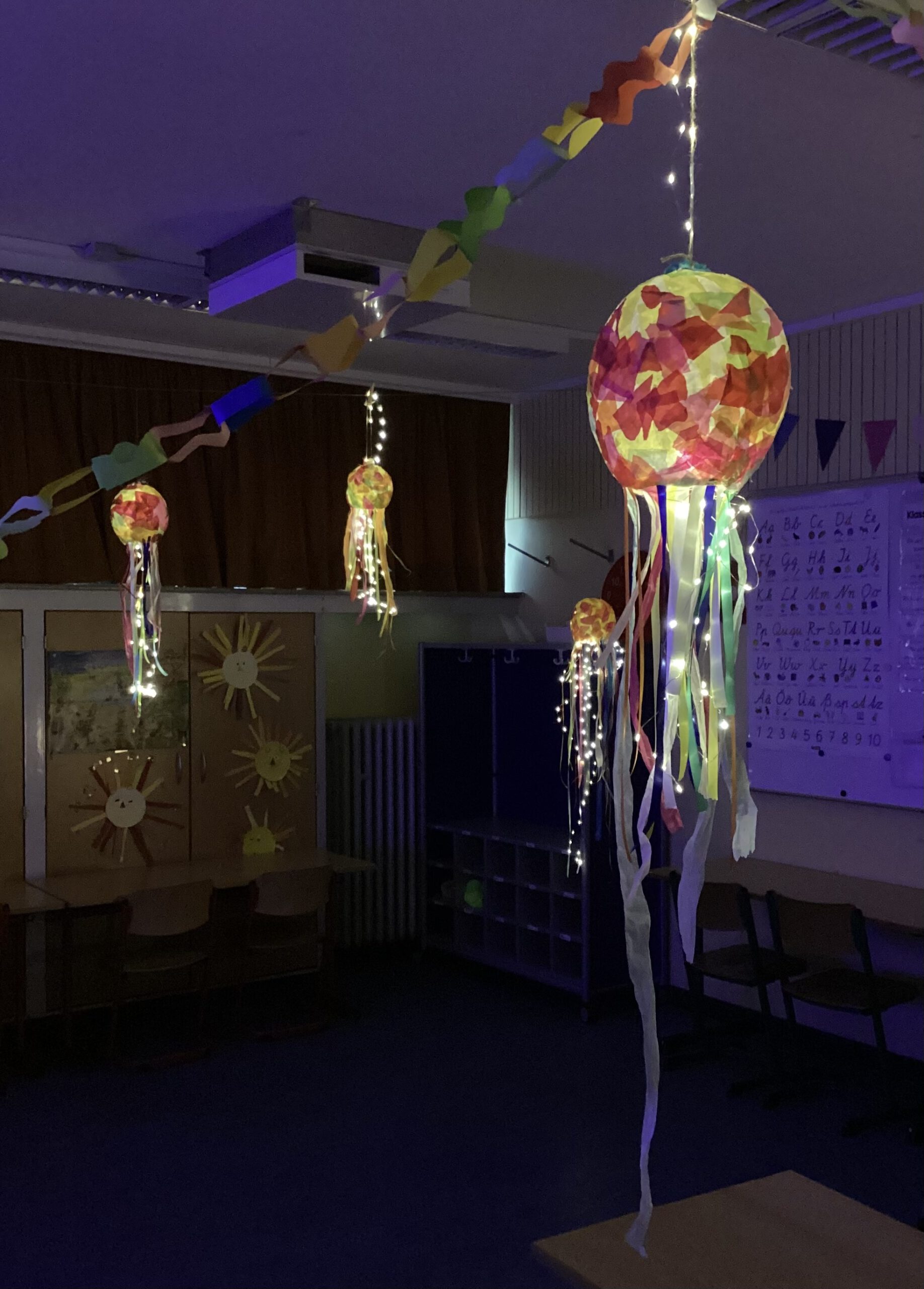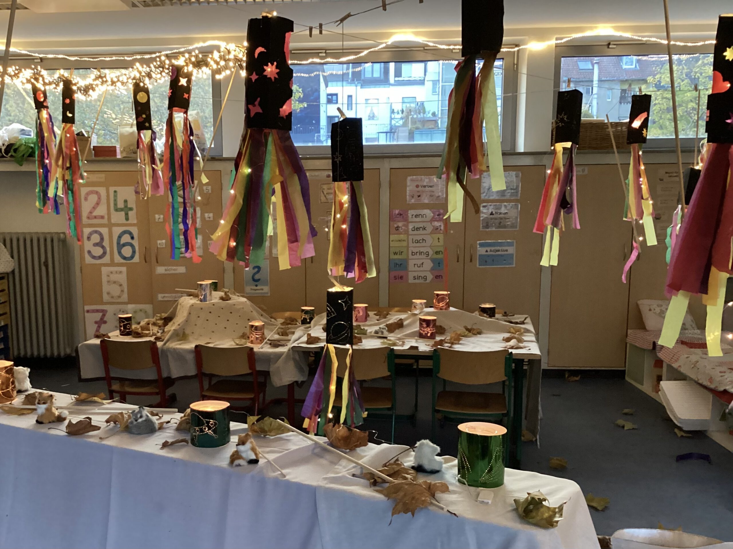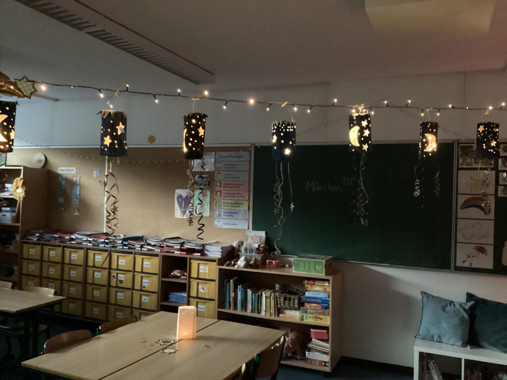 In den Klassenräumen hingen die Laternen an Fäden oder standen auf den Tischen.