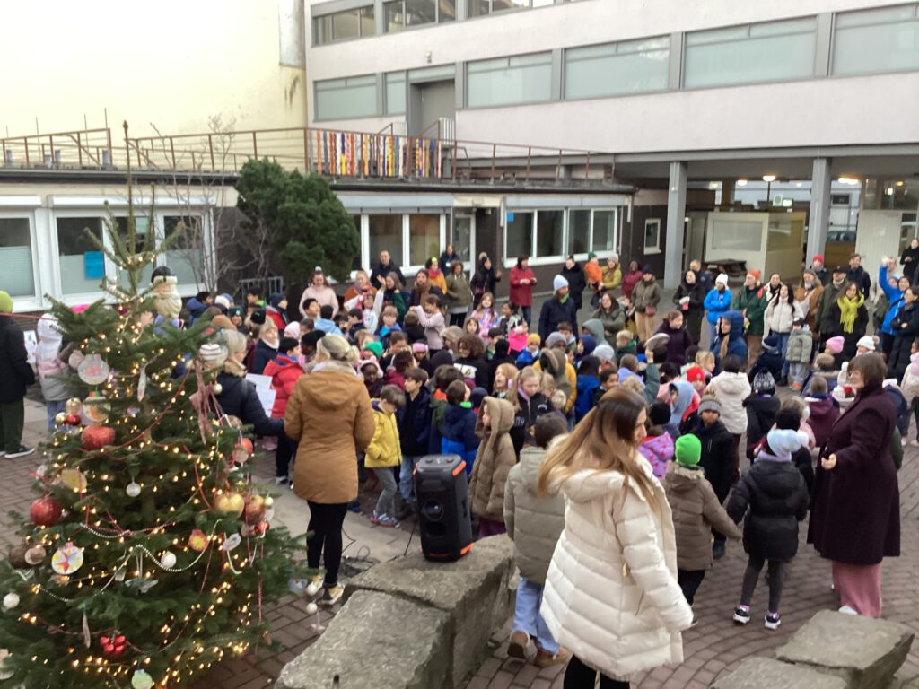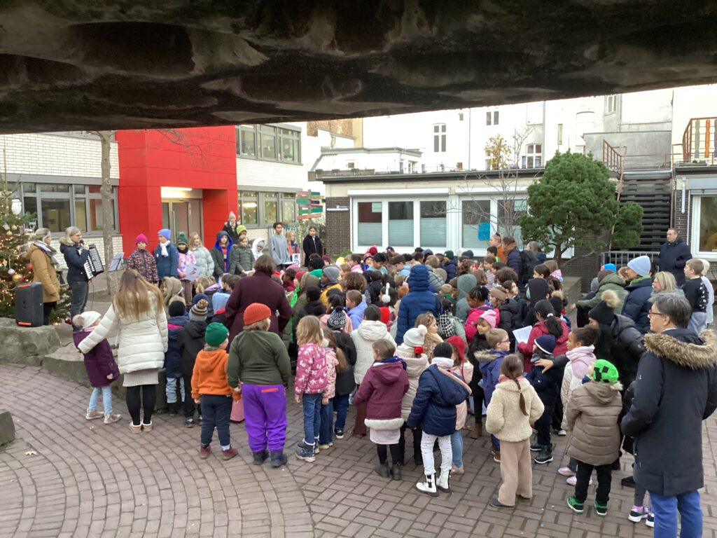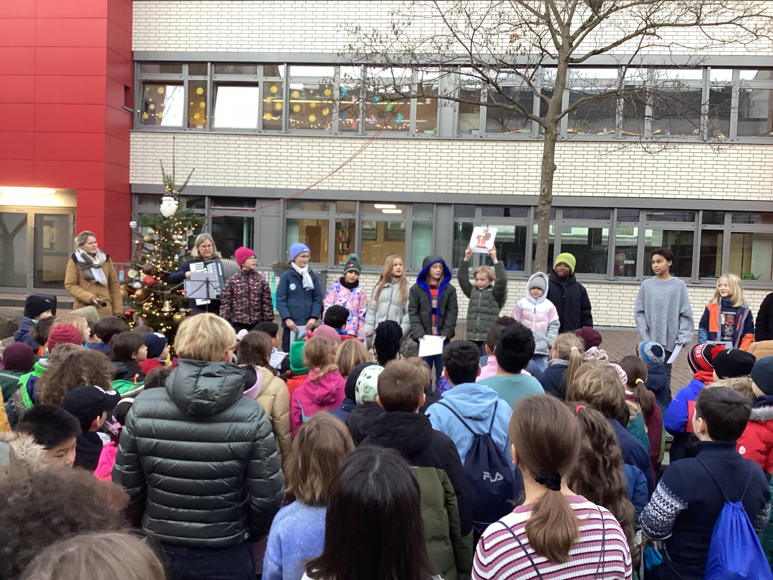 Auch in diesem Jahr singen wir in der Adventszeit wieder jeden Montag um 8:15 Uhr gemeinsam Advents-und Weihnachtslieder auf dem vorderen Schulhof. Den Anfang haben wir letzte Woche mit „Schlittenfahrt und weißer Bart“, „in der Weihnachtsbäckerei“ und „dicke rote Kerzen“ gemacht.